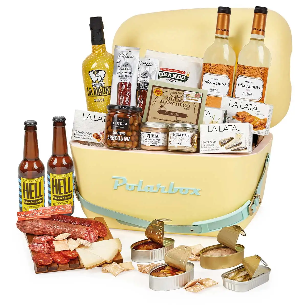 Incluye una cuidada selección de productos premium: vinos Viña Albina, cerveza artesanal Hell, embutidos curados, queso manchego DOP, conservas La Lata y La Madre, hummus, aceitunas y más delicias perfectas para compartir.