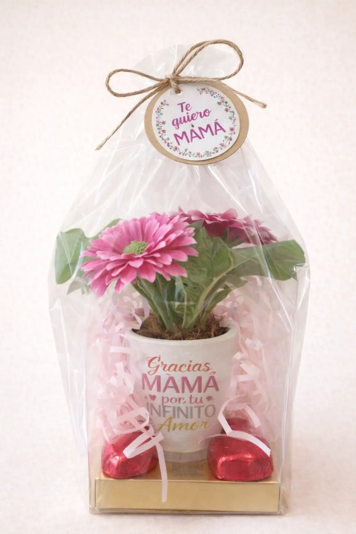 Detalle decorativo para el Día de la Madre con frase y flor en distintos colores. Plantita artificial lista para regalar.